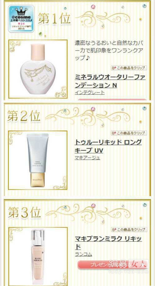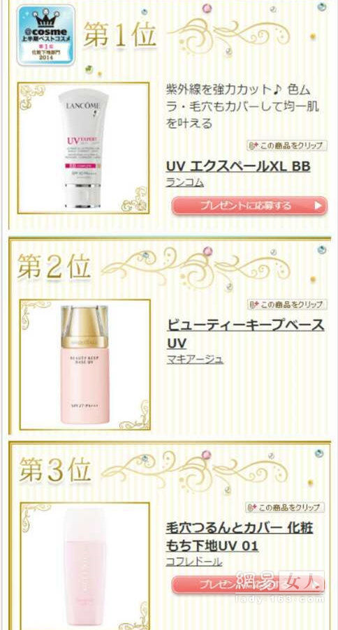 小编围观:兰蔻的BB霜连续几届都进入大奖榜单前三,润色遮瑕效果一直很有口碑,这次也算是实至名归,唯一确定就是不够防水,单独使用可能会脱妆。COFFRET D'OR作为佳丽宝旗下的平价系列彩妆,高性价比深受日本妹子的欢迎。