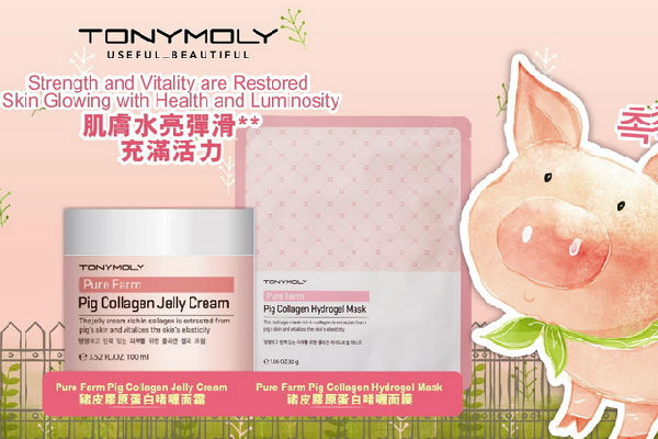 韩国出名多新奇趣怪的美容產品,继蜗牛之后,今次玩猪皮!猪皮大家平时就食得多,想不到竟然有极高的美容价值。韩国品牌TONYMOLY最新研製出全新猪皮胶原蛋白系列,包括猪皮胶原蛋白啫喱面霜及猪皮胶原蛋白水晶面膜。当中蕴含由有机农场饲养的纯净猪隻的猪皮中提炼的高浓度胶原蛋白成份,配合抗氧化的红酒成份,令肌肤立即提升紧緻度,有强效保湿作用及预防肌肤细胞衰老,而且產品更不含苯甲酸酯、二苯甲酮、矿物油、表面活性剂及人工色素5种无添加化学成份,敏感肌也可放心使用。晚晚敷猪皮Mask胜过日日食花胶啦!