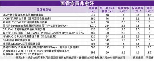 当中每瓶售 750 元的 SK-II 肌源紧致精华面霜的除皱表现最差,只有 1.5 分(最高 5 分)。