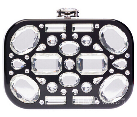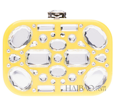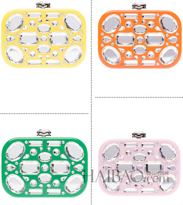 缪缪 (Miu Miu) 2014夏季Plexiglass系列手拿包与今年春季推出的Plexiglass珠宝系列一脉相承,用甜美、精致、贵气来形容一点也不为过。外形色彩如积木般的缪缪 (Miu Miu) 2014夏季Plexiglass系列手拿包将年轻与可爱的气质展现在我们面前。大小各异的有机玻璃切割成宝石形状,并有秩序的镶嵌在包包的外面。开关处采用施华洛世奇 (Swarovski) 水钻饰品来装饰,包的内部用棉缎做衬里,并附有带拉链的暗袋和能放手机的小口袋,最贴心的是配备了可拆卸式的肩带,方便又实用。
