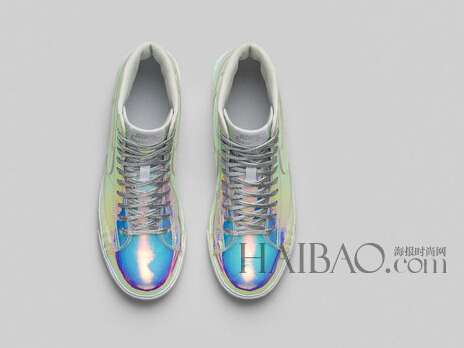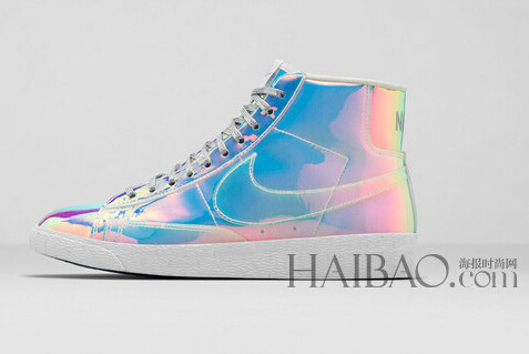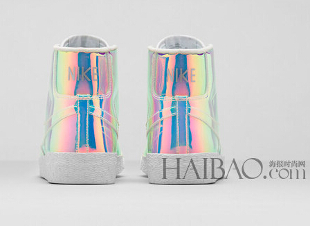 今年年初耐克 (Nike) 为庆祝Superbowl XLVIII,推出了Air Trainer 1 Mid系列鞋履后,再度以同样元素和炫彩配色延续到耐克 (Nike) Blazer Mid系列中。鞋身如彩虹变幻般呈现出漆皮质感,采用经典纯白、半透明蓝色鞋底,并配以金属色泽的银色鞋带,整体看上去酷感十足。该系列将于8月16日在官网和指定零售门店发售。