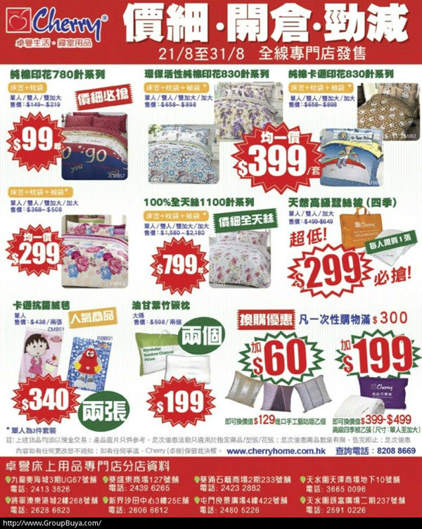 香港打折:cherry床品全线专门店价细开仓劲减优惠(至14年8月31日)