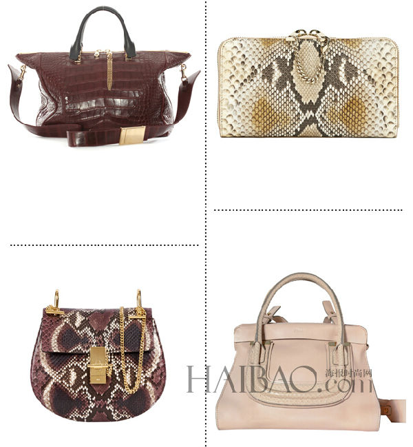 蔻依 (Chloe) 2014秋冬包袋系列设计师克莱尔·维特·凯勒 (Clare Waight Keller) 通过蟒蛇、鸵鸟、鳄鱼等一系列奢华珍贵的材质,呈现出狂野的气息。并装饰以惊艳别致的细节,激光雕刻的花纹、抛光闪亮的五金或艺术气质的几何拼图,来真正捕捉时髦、创新的Chloe包袋系列。帅气的Baylee、优雅的Drew和自在大气的Everston,分别为创意总监Clare Waight Keller的最新力作,通过不同款式来展现Chloe女孩的多面性。