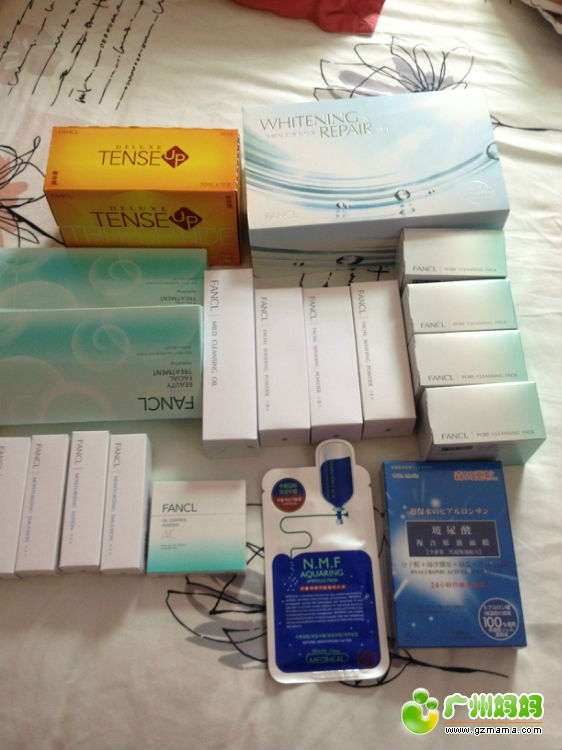 由上往下,由左往右,依次是:第一排是胶原蛋白饮料、美白套装(里面有美白面貌、美白精华液);第二排:面膜、卸妆油、洁面粉、黑头面膜;第三排:爽肤水、乳液、控油粉末。最后2个不是FANCL的产品,只是放在这里而已。有NMF针剂面膜(近期好热,我还没有试)。万宁购买,约22元港币一片。还有森田药妆的面膜,约35元港币一盒,这个玻尿酸冬天用很好,非常补水。