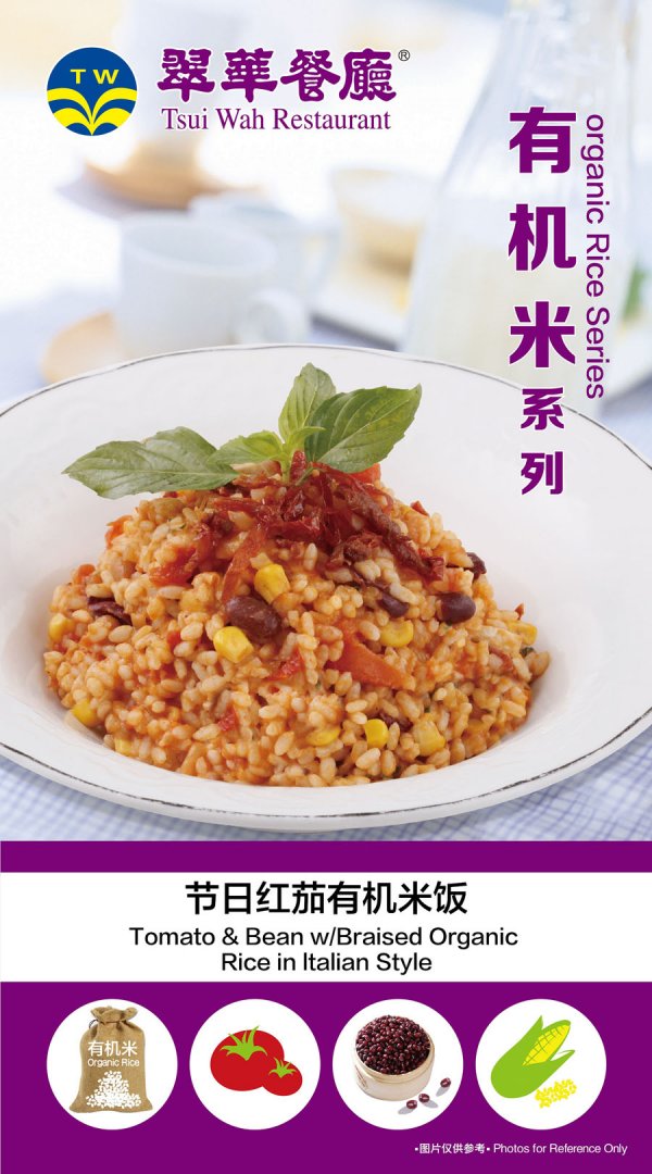 意大利节日红茄有机米饭意大利人欢度新年时爱吃这一道健康菜式!翠华加入新鲜蕃茄、半干红茄、菜豆类和秘制香料烹调这道有机米饭,不仅有香浓的蕃茄鲜味,而且每一口都充满健康元素!