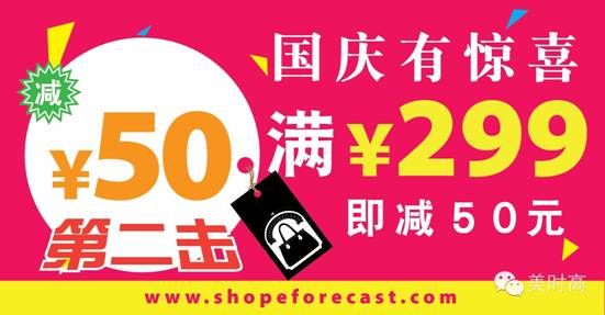国庆有惊喜,实惠送给你。凡在Shopforecast店购满¥299元,立减¥50元。更多优惠请登入:http://shop111696235.tw.taobao.com/?_:TB-GBK,亲们,赶快来抢吧。