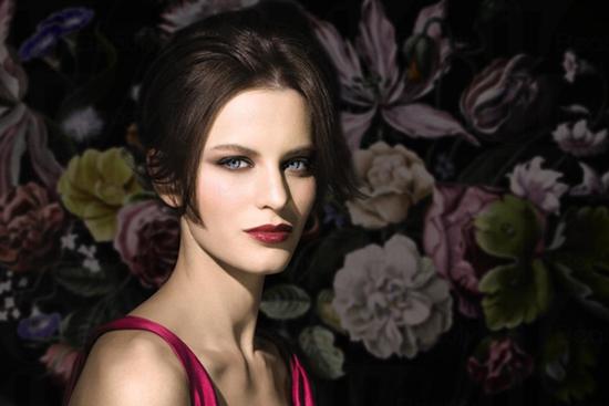眼妆方面,以枫叶的深棕和深遂红桐,亦以棕、粉、金、绿眼彩闪烁冰冷金属光泽,以浓厚的烟熏珠光,加重眼神轮廓;粉红双颊透露著典雅气质,微微地透出银色珠光质感的裸粉色,最后以强烈醒目的紫枫唇妆,展现秋彩魅力。