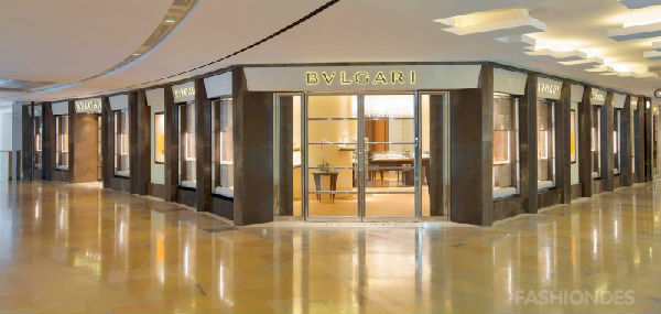 全新Bulgari专门店总面积逾300平方米,贯彻品牌的尊贵、意大利传统以及追求卓越的精神。店面入口处采用了来自地中海的White Trani大理石和色彩夺目的Gris Pulpis云石壁柱。在白色的大理石壁上,映照着BVLGARI的标志。6个大型橱窗以大理石包围着,而中间则是标志性的Condotti展示柜 – 饰以Imperial Saffron山东绸装饰的陈列橱窗。这些特大橱窗正好与位于罗马康多缇10号的Bulgari历史旗舰店的设计相呼应。
