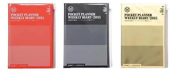又是时候入手明年的手帐日誌了!英国时尚品牌MONOCLE再次与日本高质素文具设计品牌MARK'S联乘合作,推出2015年度限量版周记,大概是不少时尚型人之选。虽与去年的设计大致上差不多,同样以拉鍊式的塑胶口袋封面為卖点,方便用家把自己的随身小物置於其中。不过,口袋上深浅不一的网纹分佈令整本笔记来得更有格调。内页除可供大家纪录心情外,更提供铁路、多国用词等资料,较坊间一般手帐实用。设计备有鲜红、纯黑及象牙白三色,迎合不同风格的用家。