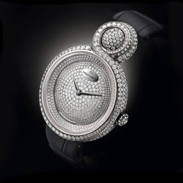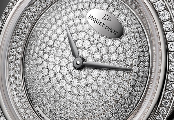 闪耀优雅8(Lady 8 Shiny)腕表外形温润柔美,专为欣赏时间感性之美的女性设计。白金镶钻表盘(1.49克拉)在宝石的点缀下华丽动人。雅克德罗还为此款腕表加以巧妙设计,见证品牌珠宝工坊卓越非凡的工艺:表壳上方镶饰美钻滚珠(1.4克拉),令佩戴者不禁轻抚触摸。