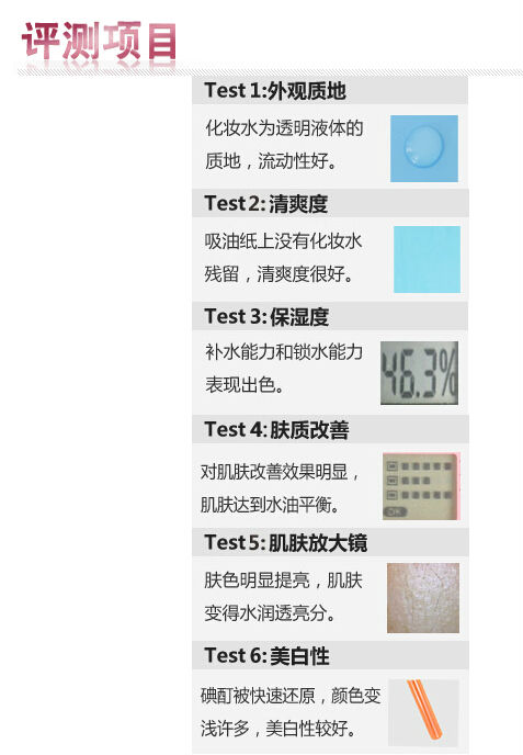 评测结果:使用化妆水后,肌肤的肤色明显提亮,紧绷的肌肤瞬间补给了水分,肌肤变得水润透亮、莹润饱满;同时化妆水还可以收缩粗大的毛孔,使肌肤细腻柔滑。