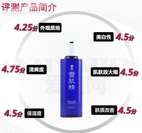 编辑观点:高丝雪肌精化妆水深蓝色瓶身的简洁大方,质地为无色透明的液体,吸收性强,能迅速被肌肤吸收;它的保湿效果很好,能迅速补充肌肤水份,使用1小时后肌肤仍有46.3%的水分值,可见其保湿效果显著。另外它能有效改善肌肤状况,使肌肤达到水油平衡,蕴含多种汉方精华和汉植物萃取液,美白抗氧的效果很好,能防止黑色素沉淀。使用后,肌肤变得水润透亮、有光泽,总体来说是一款值得推荐的美白化妆水。