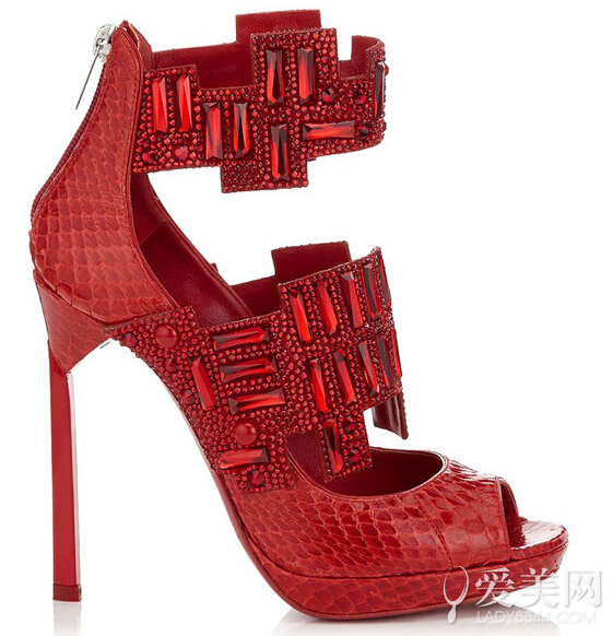 这双鞋的设计灵感大概是来自于对深红宝石常渐现在众人面前那迷人的色调的迷恋,加入如此多方位的风格捕捉以及强大半宝石诱人的元素,使得整款鞋高贵感十足,聚焦指数极高。而图形的鞋跟质料则使用极具异国情调的蛇鳞皮革,让人感觉诡异十足,捉摸不透。