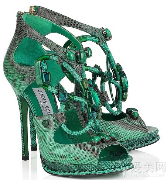这次系列多见半宝石元素。如这款鞋的孔雀石绿黄水晶或墨绿玉,两者相互交织结合充满异国情调的皮革皮,营造出一一双惊人的和无所畏惧的平台凉鞋。Jimmy Choo这次的系列设计可谓用心良苦。而无论是这次的鞋款还是设计风格都是引人入胜的,同时独一无二!