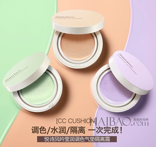 为满足更高的底妆需求,主打裸妆的BB霜诞生了,随后融入护肤概念的调色CC霜也诞生了。现在悦诗风吟 (innisfree) 首次把气垫技术与调色CC霜相结合,全新推出气垫CC。