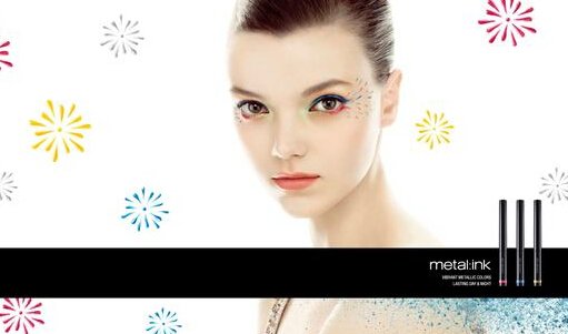 在金属漆感这一主题下,打出角康先生专注于创造新的季节妆容,它给人喜庆、清新、前卫的感觉并附有艺术气质,独具一格。金属色调的眼妆灵感来源于日式烟火( hanabi),在眼睑上跃动闪耀。2015春夏“hanabi”烟花金属感带来了令人耳目一新的流行文化影响,大胆的金属感睫毛令整体妆容倍感现代魅力。