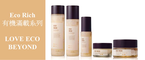 踏入新一年,BEYOND又再带动绿色有机热潮,推出全新Eco Rich有机满载系列。全线產品均选用有机奥米加坚果复合物及获法国生态认证中心颁发ECOCERT有机认证的积雪草复合物,高度保湿,令欠缺光泽及乾涸的衰老肌肤重现光采。