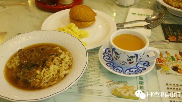 早餐吃的是翠华餐厅招牌,沙嗲牛肉公仔面+奶茶+猪仔包还不错~就油麻地港铁A口附近很好找。