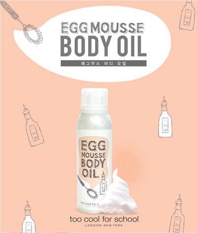 冬天天气干燥,皮肤缺水、绷紧,干纹增生,肌肤犹如一夜之间老了十岁。要极速抢救dry爆肌肤,自然想要润肤油的深层滋润,却怕「油淋淋」的感觉?too cool for school 最新推出的2in 1 Egg Mousse Body Oil,其柔滑且富弹性的泡沫,能瞬间融入肌肤。用后清爽滋润,立即穿上衣服,都绝不感油腻!
