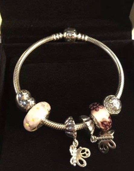 拍的有点反光,第一个心形的是固定扣,399港币,第二个是透明的琉璃珠子,里面有粉色的桃花花瓣,实物比照片美,299港币,一对蝴蝶599港币,紫色琉璃珠子也是299港币,最后一个星星月亮的固定扣也是599港币,单手链是699港币,全部加起来人民币2300多,算是比较划算的吧,关键是自己很喜欢。在香港买比在这边买便宜太多了。