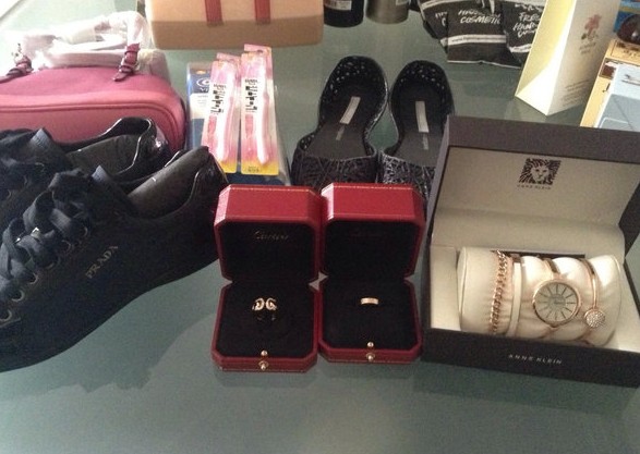 卡地亚购于利园,价格分别是34600和8300港币;AK手表购于dfs铜锣湾店1400港币;鞋子购于prada工厂店,2000+具体价格记不清了,COACH购于东荟城1680港币;FURLA也在东荟城购入,价格2490港币;lush洗发皂在龙城大药房隔壁买的,118/块;象印杯子在sogo买的,249的样子