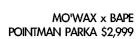 今回MO'WAX×BAPE联名企划的创作焦点除包括用上真皮材质与细密刺绣所打造出的VARSITY JACKET,以及同时结合了POINTMAN标记与BAPE猿人图像的两款T-SHIRT作品之外,当中破天荒引用BAPE经典名物SHARK PARKA改造而成的POINTMAN PARKA,更凭着玩味十足的外星帽子设定,还有衫身及衣袖所出现的ATOM原子球图案,成为整个系列中的定番焦点。