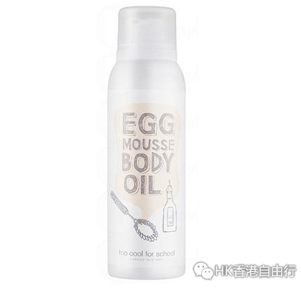 Egg Mousse Body Oil 为泡沫状,以皇牌鸡蛋萃取,同时蕴含5 种天然植物油(包括橄榄油、杏仁油、牛油果油、荷荷巴油及漆树果仁油),为肌肤进行进行深层保湿,没有油腻感。
