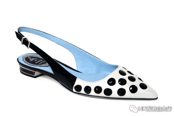 The Polka Dot:尖头平底露跟鞋以黑白色为主题,鞋面饰以大颗圆形水晶,形成立体的波点效果。 (HKD 7,700)
