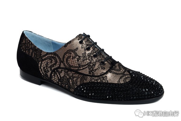 The Oxford:经典绑带皮鞋以玫瑰金色皮革打造,披上精致Soltiss蕾丝,鞋头镶嵌施华洛世奇水晶,展现对比效果。 (HKD 8,850)