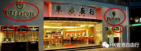 香港法律严谨,如果该表行没有被授权销售某品牌,表行绝对不敢明目张胆的放出某品牌的招牌的,被查到后果很严重。所以如果你在街上,看到表行门口有你想要买的品牌的招牌(如图二,该表行有帝舵劳力士等授权),就尽管放心的进去选购吧。