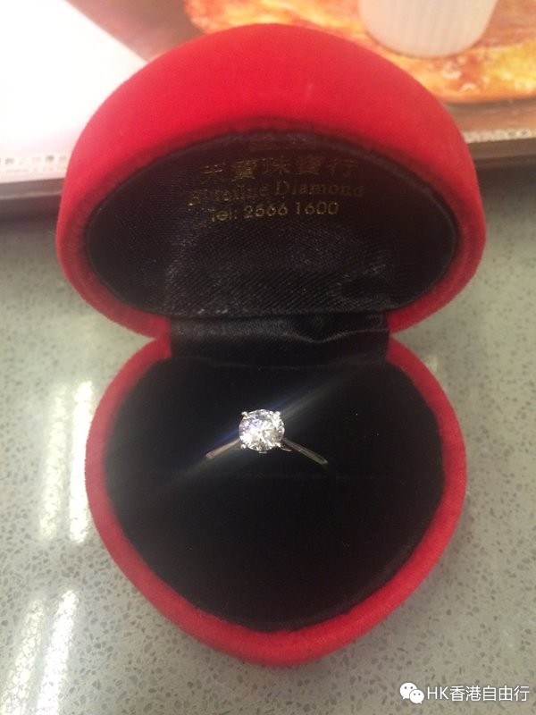 周六下午1点左右到香港,因为穿着宽松的毛衣,不胖不瘦的我居然被海关姐姐问是否怀孕!!可见香港现在管得有多严,之前看到有人说4个月就不让入港了,各位请留心咯。出了码头我们直奔炮台山找bluefine,我们去到bluefine的时候,老板在接待客人~接待我们的是一位年轻的美女。问了我们预算和要求后(50-60分,G色以上,vs1以上),给我们拿了几颗参考,分别是54分、57分和61分的。本来我的理想是57分、F色、vs1以上,不过那里没有。。最后选了57分、E色、vs2,3ex,none。美女很认真的给我们看vs2的瑕疵在那里,只是在底部有一点feather,算比较干净所以她也很推荐,而且57分和给我们看的61分没什么区别(61分虽然净度颜色都很高但是不知道为什么感觉比其它两颗要暗)。戒托选了最简单的直臂四爪,非常满意~!