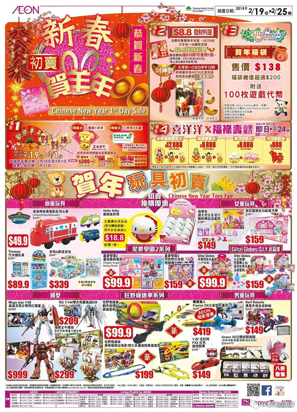 AEON: 羊年到了!祝大家新春飞扬,洋洋得意,羊年财顺,羊年行大运!由大年初一起,AEON於2015年2月19日(四)至2月25日(三)举行「AEON新春初卖贺羊年」,包括「贺年玩具初卖」、「贺年美饌团圆盛宴」、「均一价」及「新春床品初卖」,大量精选商品以优惠价发售,陪你渡过新春佳节,喜庆过羊年!(点击为高清图)