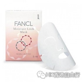 Fancl 锁水补湿精华面膜 (HK$180/3 片) 蕴含18ml 丰富美容液,能渗透至肌肤底层,并於肌肤表面形成滋润薄膜,锁住水份。全脸加眼膜剪裁,连脆弱的眼周肌肤都照顾得到,深层高效补湿,令肌肤持久滋润饱满。