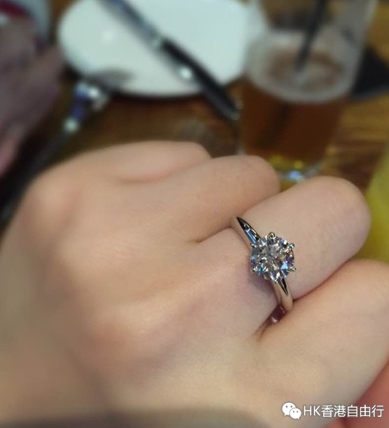 年初二中午港龙航空飞香港,下午四点左右到达赤腊角机场,坐机场大巴A21,中间道站下,离酒店非常近,1小时路程。本来想买卡地亚的钻戒,结果人家过年休息,初四才营业,决定去Tiffany看看,去的1881店,买了钻戒和对戒,钻戒1.27克拉,D色,vs1,3EX,NONE,经典六爪,下单改戒圈,初四晚上取回。