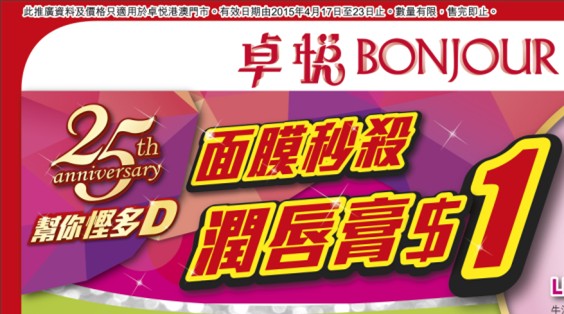 香港打折:卓悦Bonjour最新门市优惠(15年4月17日至4月23日)