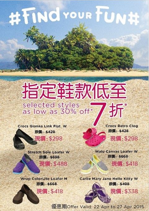 香港打折:Crocs指定鞋款低至7折(2015年4月22日至27日)
