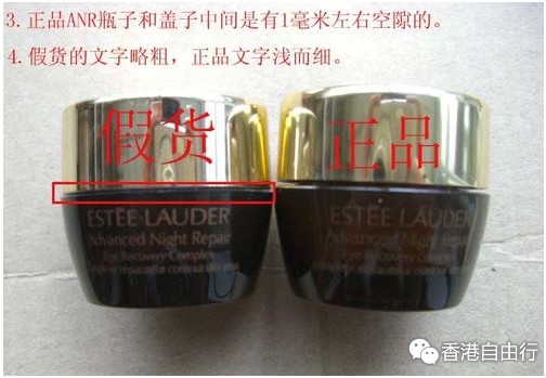 防骗第二招:看雅诗兰黛瓶盖和瓶子之间的空隙 正品瓶盖和瓶子有一点空隙,假货没有。正品的文字浅,而且细。