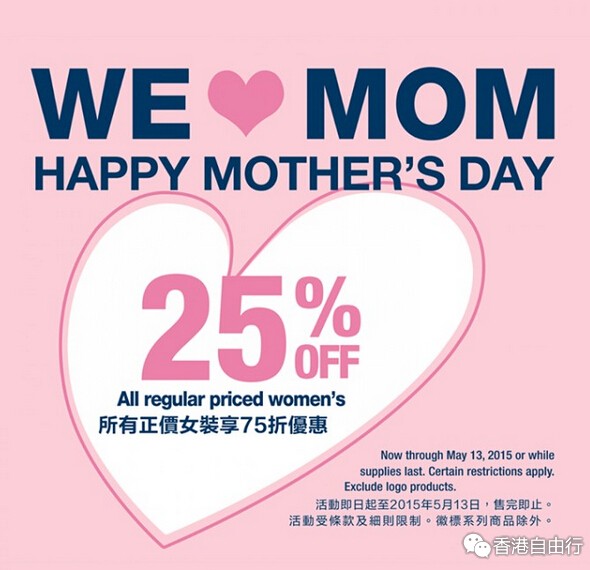 香港打折:GAP 母亲节正价女装75折优惠(至15年5月13日)