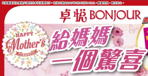 香港打折:卓悦Bonjour最美母亲节购物优惠(15年5月8日至5月14日)