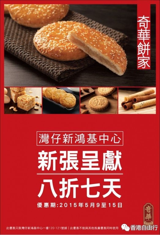 香港打折:奇华饼家于新鸿基中心分店新张呈现八折七天优惠(2015年5月9日至5月15日);
