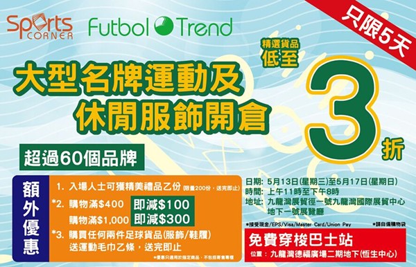 香港优惠:Sports Corner / Futbol Trend 名牌运动服饰开仓低至3折(15年5月13至17日)