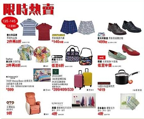 3. 男/女/童服饰鞋履及手袋折实后2件再9折(单一部门单一发票计算,指定货品除外)