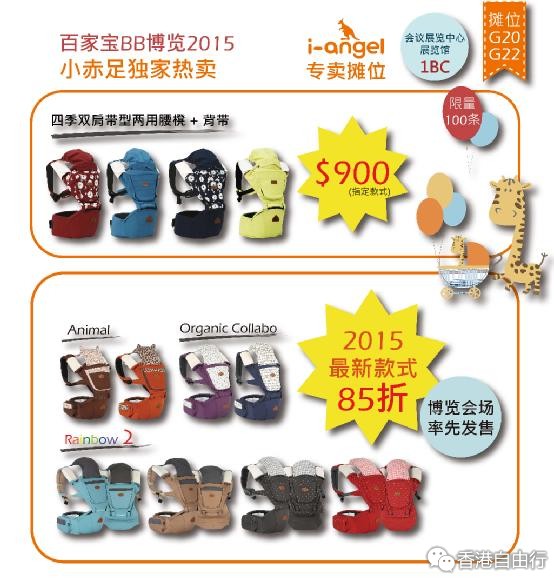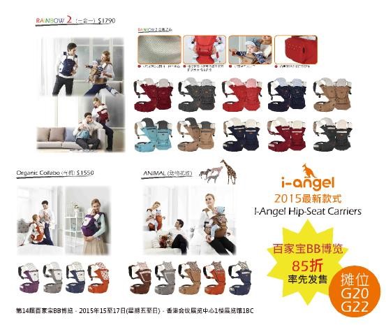 5月15至17日,小赤足将于「百家宝BB博览2015」参展,届时特设I-Angel专卖摊位,指定款式的背带只需$900。而且,2015最新型号—Rainbow 2、Organic Collabo(有机)及Animal(动物花纹)将于博览当日率先登场,并设85折优惠。
