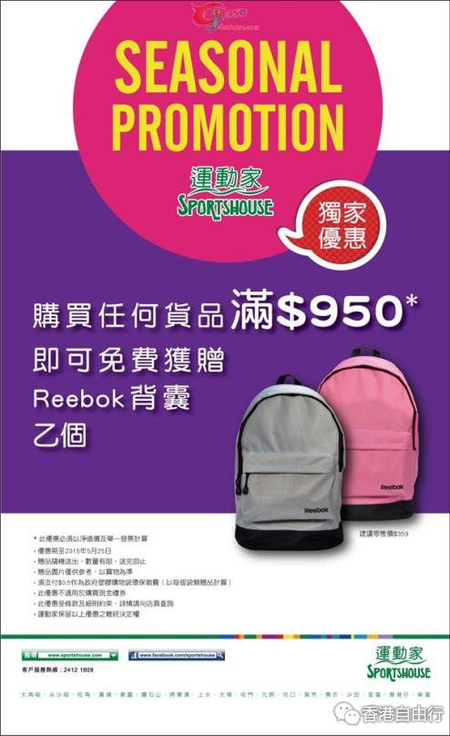 运动家Reebok背囊推广优惠(至15年5月25日);