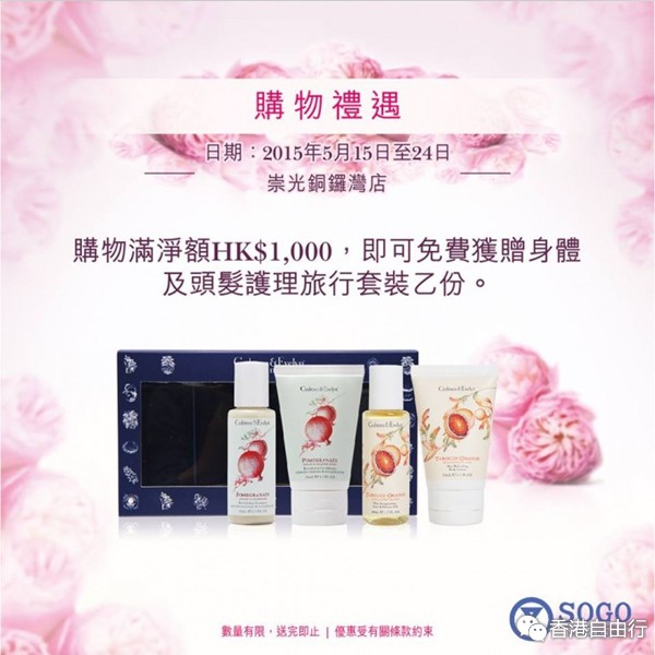 香港打折:Crabtree & Evelyn崇光30 周年铜锣湾店独家优惠(2015年5月15日至24日)