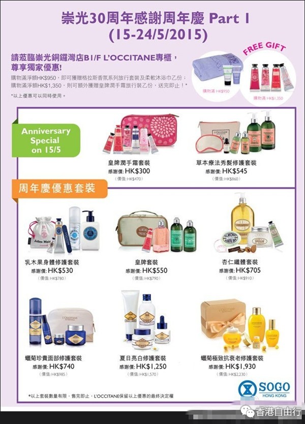 香港打折:欧舒丹L'Occitane 祟光百货30周年感谢周年庆购物优惠(至15年5月24日)