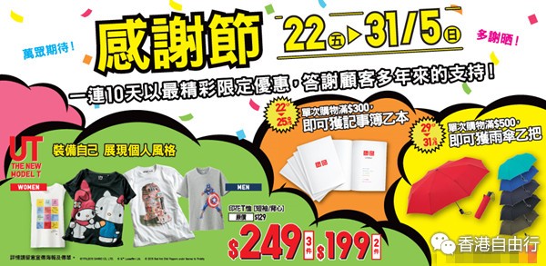 香港打折:优衣库UNIQLO感谢节 一连十天精彩购物优惠(15年5月22至31日)