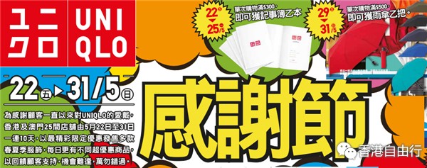 香港打折:优衣库UNIQLO 感谢节购物优惠海报抢先看(15年5月22至31日)