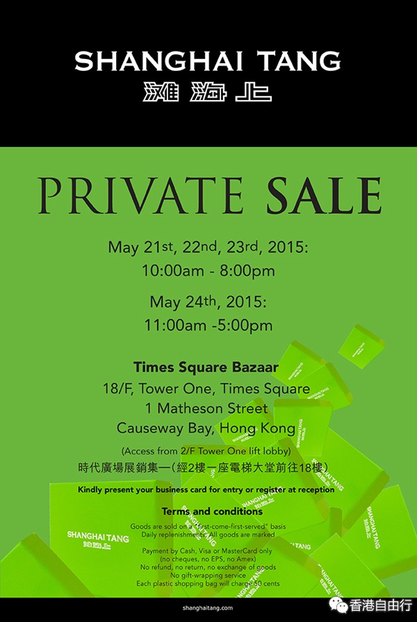 香港打折:时代广场Shanghai Tang Private Sale(2015年5月21日至24日);