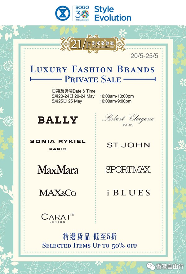 香港打折:sogo崇光百货铜锣湾店21F 精选货品低至5折(15年5月20至25日)